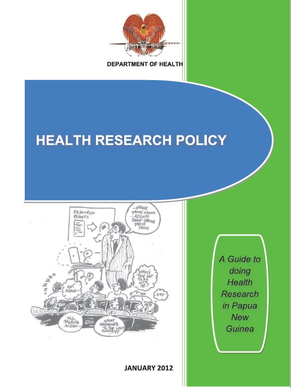 The 2012 Health Research Policy provides context and directions to researchers wanting to conduct research in Papua New Guinea. It provides goals, objectives and strategies to guide the implementation of research in the country. It was developed based on the 2001-2010 National Health Plan, which called for greater participation of health research at all levels of health care.